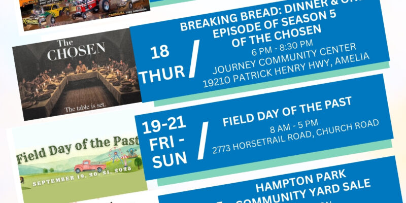 🍂 Fall fun is rolling through Central Virginia, and this week is full of can’t-miss events! 🎡🎶🛍️ ✨ The Amelia 360 Carnival & Tractor Pull 🎠🚜✨ Breaking Bread with dinner + an episode of The Chosen 🍽️🙏✨ Field Day of the Past with old-fashioned fun 🕰️🎶✨ Hampton Park Community Yard Sale 🏡🛍️✨ The Night Market […]