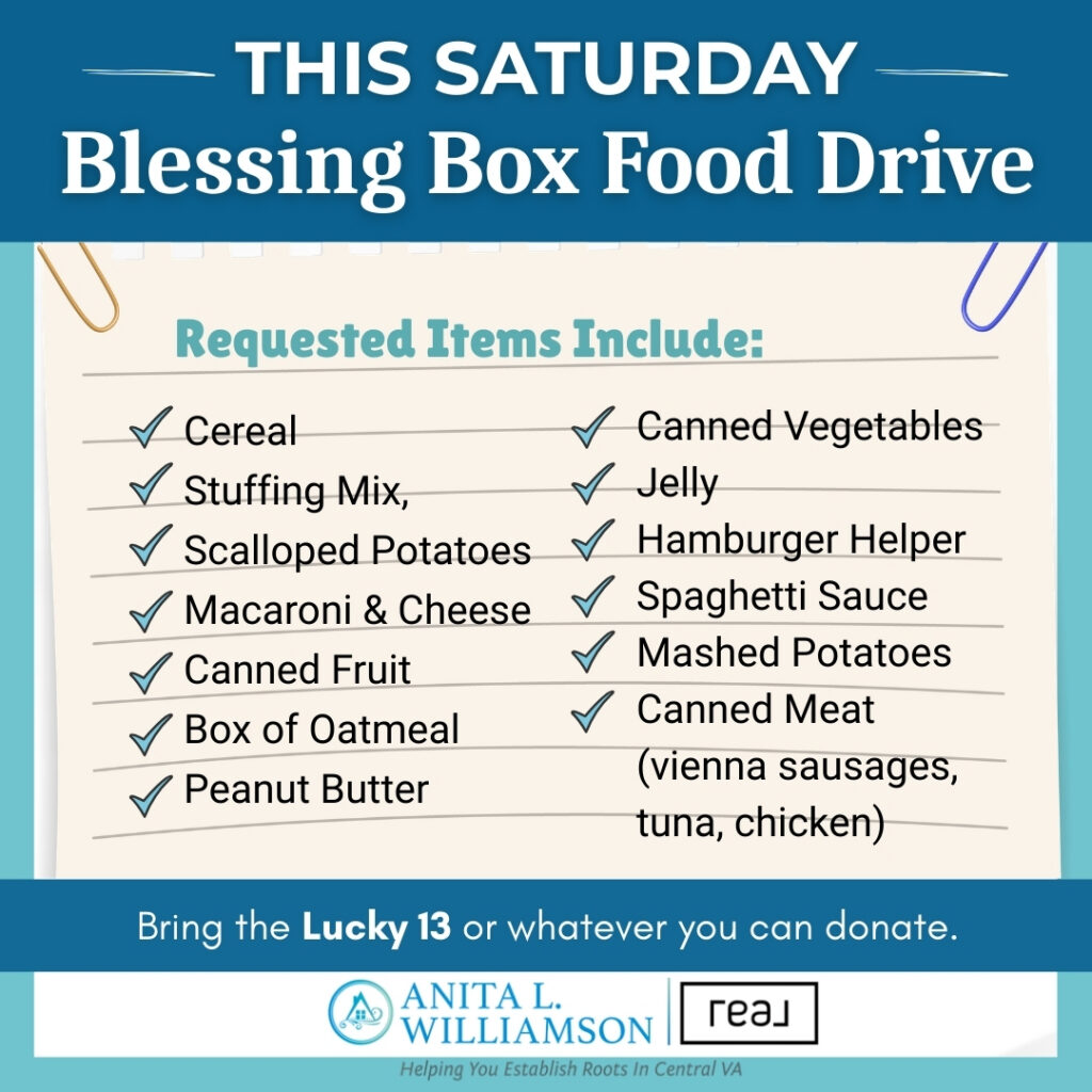 Weβre collecting Blessing Boxes for the Amelia County Food Pantry, and every item makes a difference for families in our community.